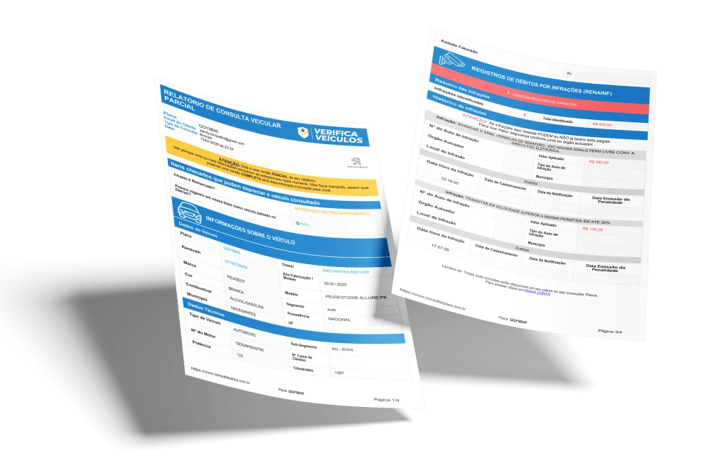 Consulte tudo sobre qualquer veículo: multas, registro de roubo ou furto, situação do IPVA, histórico de leilões, sinistros, perda total, restrições financeiras e muito mais.